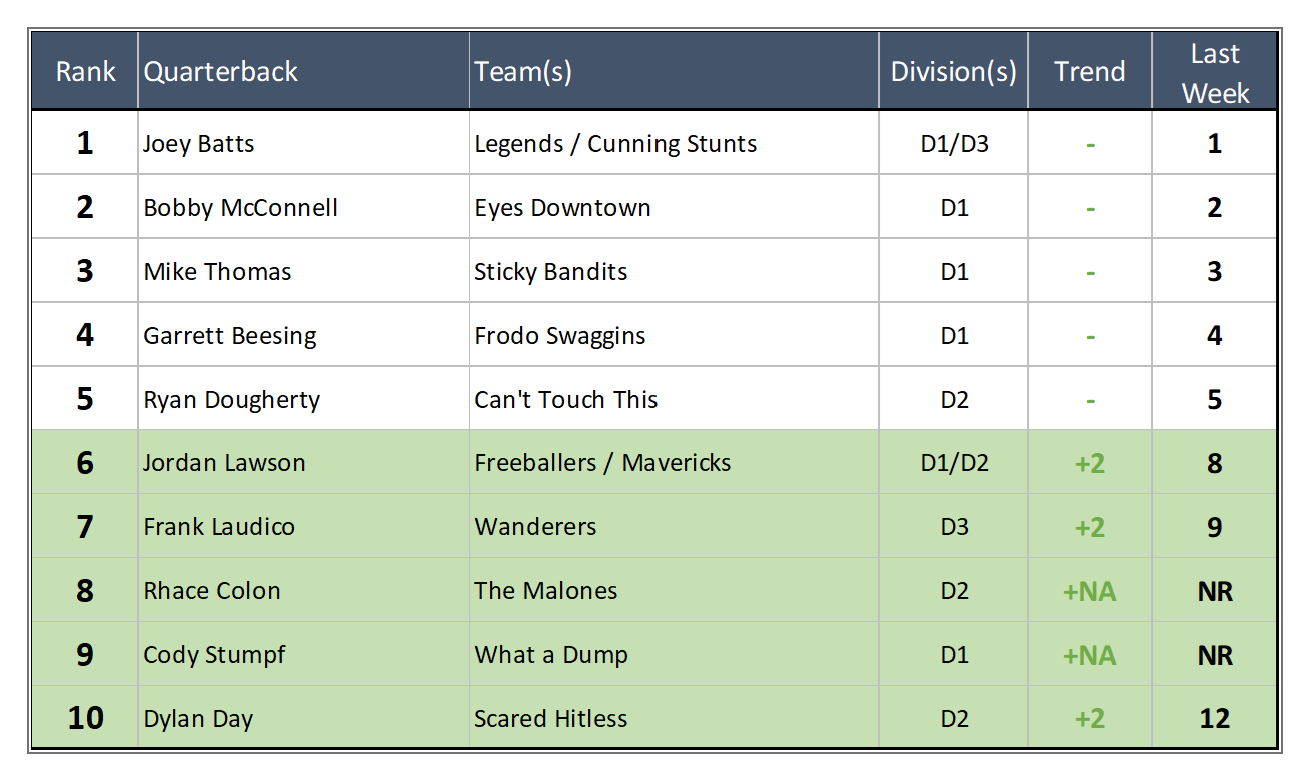 We don’t like putting “rookie QBs” in the Top Ten until they’ve had a few more games to prove their worth, but The Malones looked PRETTY GOOD against a solid Scared Hitless team last week. It sounds like Rhace is taking over from Andy Strug this session (who is moving to receiver). That’s a bold move for a team that was on the verge of winning D2 last session with their last QB.