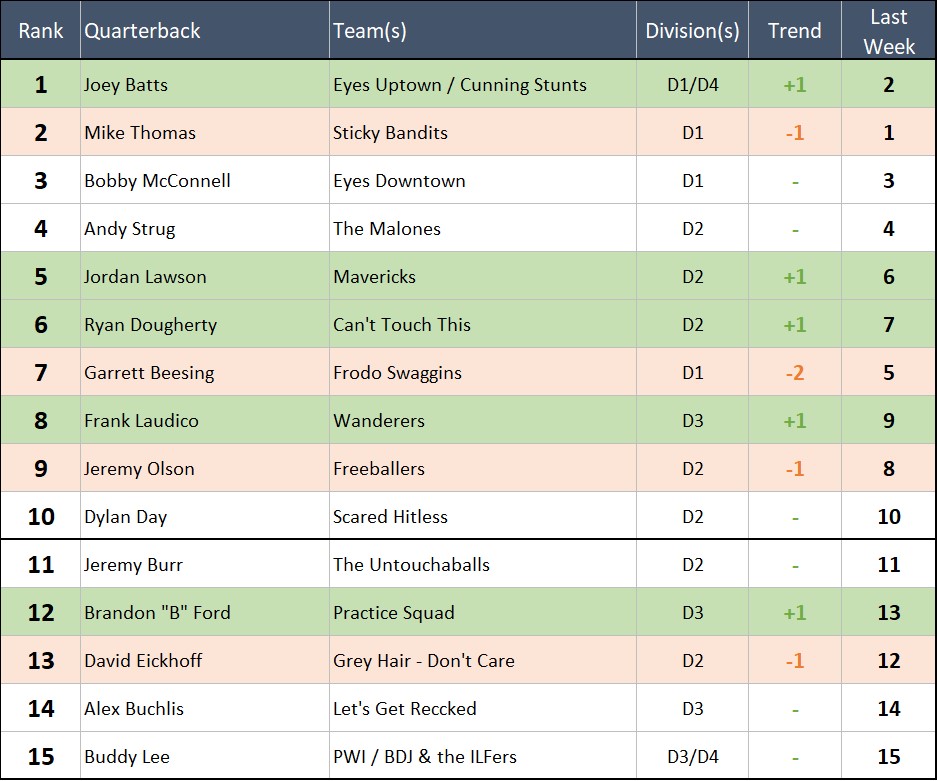 That's it for the TSL Power Rankings this week! As we said above, we don't currently have our own email address anymore, so if you have any thoughts about QB rankings, or you want to make sure we know who's throwing for your team, please feel free to contact our good friend This email address is being protected from spambots. You need JavaScript enabled to view it. . You tell him, he'll tell us.