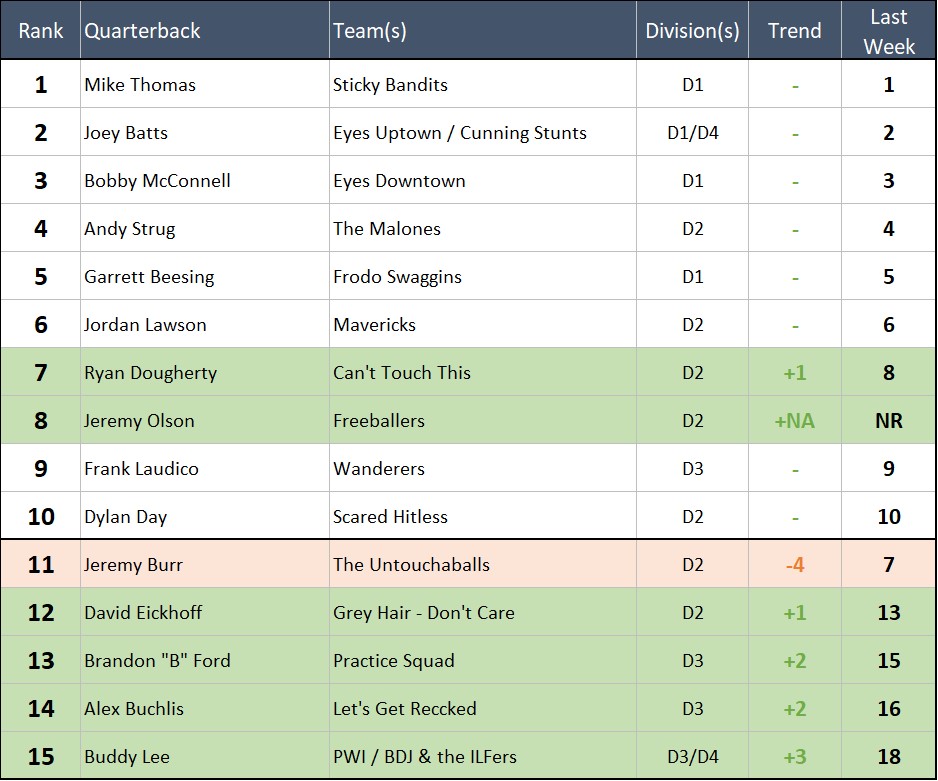 Welcome back to the TSL Quarterback Power Rankings! If you've read our article in the past (if for no other reason than to complain about how wrong we are) then you’re familiar with the concept – every week we share our rankings for the Top QBs in the League and discuss who’s trending up and who's trending down. We on the QB Power Rankings Committee are not what you'd call "great writers" (or even "very good" writers... check out the Godfather if you want better writing) so we typically lean heavily on graphs and stats instead... at least, we do after a few weeks, when there's significant enough data to bother sharing. In our season opening articles we also make a few predictions for the session and re-print an explanation of how these Power Rankings work, which we've copied and pasted almost verbatim from previous articles.