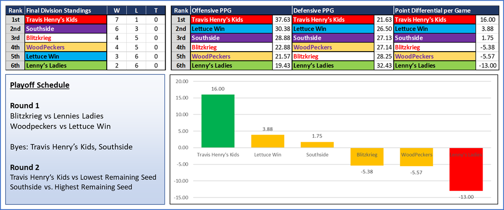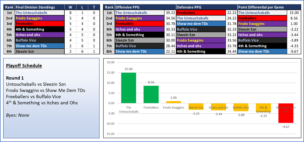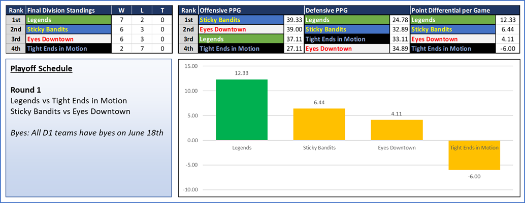 Underrated: It would be easy to say Tight Ends in Motion are the most underrated team in the division since they have by far the best point differential in the entire LEAGUE despite being a #2 seed in their own division. But they also lost to a D2 team last week and Legends the week before that, so as far as momentum goes, they are ice cold at the moment.