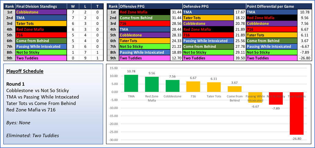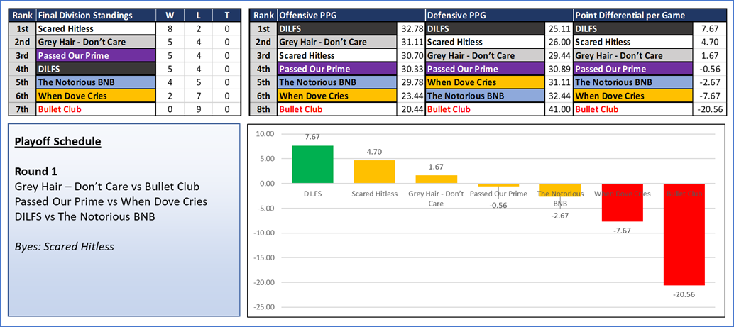 Underrated: Passing While Intoxicated has the most average record you can possibly have in a nine-game season (4-4-1) but they're slightly above average in offense (3rd), defense (2nd) and point differential per game (3rd) in their division. There's no one glaring weakness to this team that should hold them back in the playoffs, PLUS they have now beaten the two favorites in their division in back-to-back weeks to end the season. If that doesn't inspire confidence in your team, nothing will.