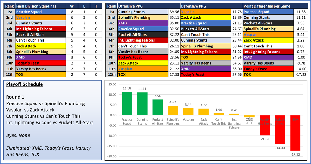 - The breakdown of best offenses, defenses and net point differentials per division. As always, stats below have removed forfeit games from the math, so what you see on the charts may not match the website (intentionally). We tried to color each team's data by their official jersey colors, but half this league apparently uses black so it's not perfect.