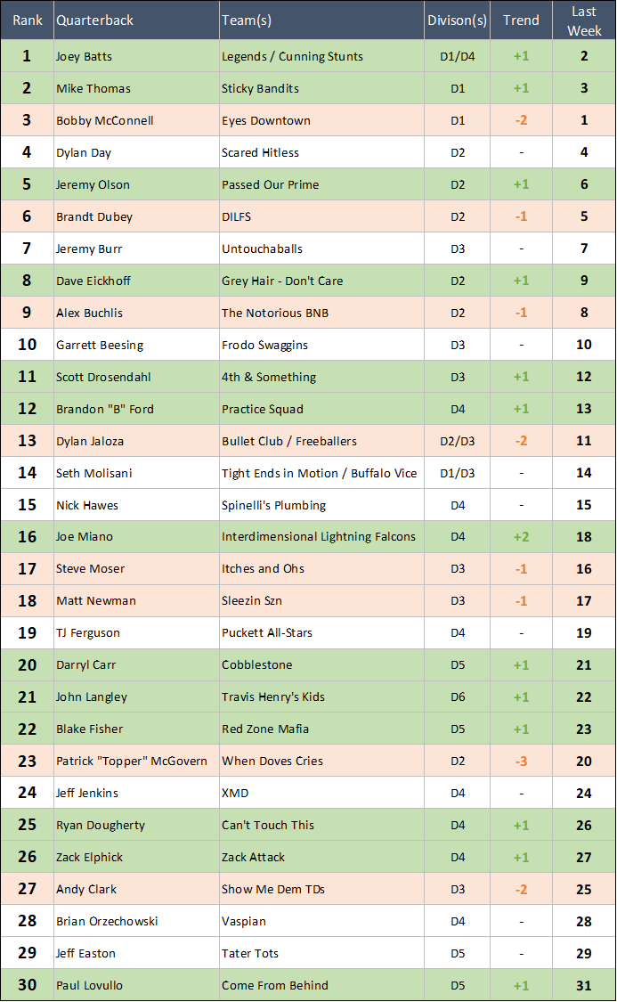 The last time we wrote about how Bobby had lost two games in a row, we're PRETTY sure he rattled off a seven game winning streak afterwards, so we're not ready to dismiss Eyes Downtown as contenders just yet. Wins and losses admittedly play a huge part in our rankings, as they should, but even with a 1-2 record, is there anyone in this League who doesn't think Bobby F'n McConnell is one of the top QBs in the League?