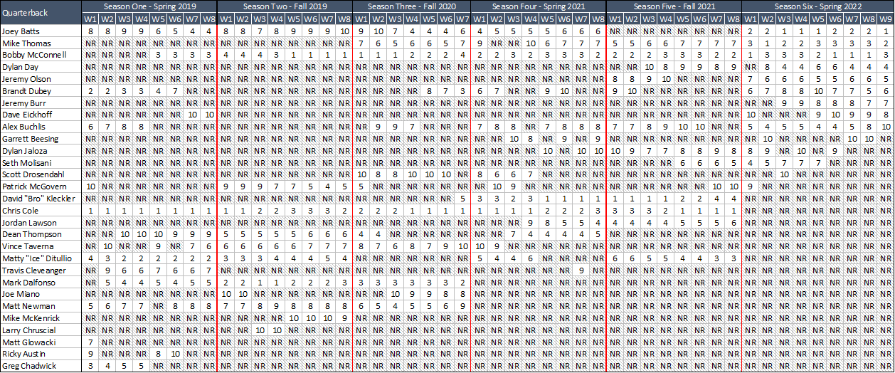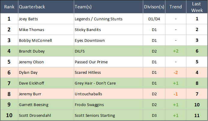 Remember when Joey's brother QBed for Gryffindor and Joey was just an awesome receiver? That has nothing to do with the QB Rankings, we just wanted to remind you that he can indeed do it all. Two more wins for Legends have them right in the hunt for the #1 seed should the Sticky Bandits stumble. Not sure why the Stunts aren't doing better.