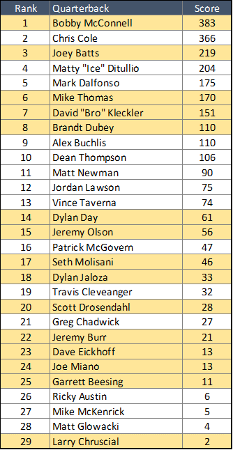 That's it for the TSL Power Rankings this week! We don't currently have our own email address anymore, so if you have any thoughts about QB rankings, or you want to make sure we know who's throwing for your team, please feel free to contact our good friend This email address is being protected from spambots. You need JavaScript enabled to view it.. You tell him, he'll tell us.