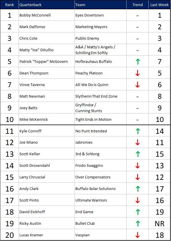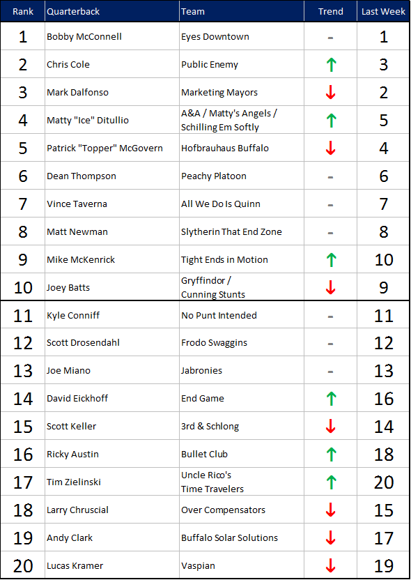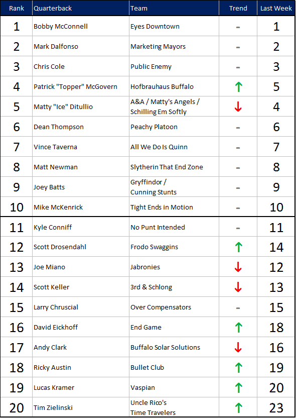 Welcome back to another “critically acclaimed” edition of your TSL Quarterback Power Rankings! Your headline for this week: there’s a new king of the mountain. Chris Cole held our top spot for ten weeks, including all of last season and the first two weeks of Fall 2019. Mark Dalfonso, defending D1 champion, then took over the top spot for two weeks. And now we have our third #1 Quarterback in the season-and-a-half history of the TSL QB Power Rankings: Bobby McConnell. Long may he reign.
