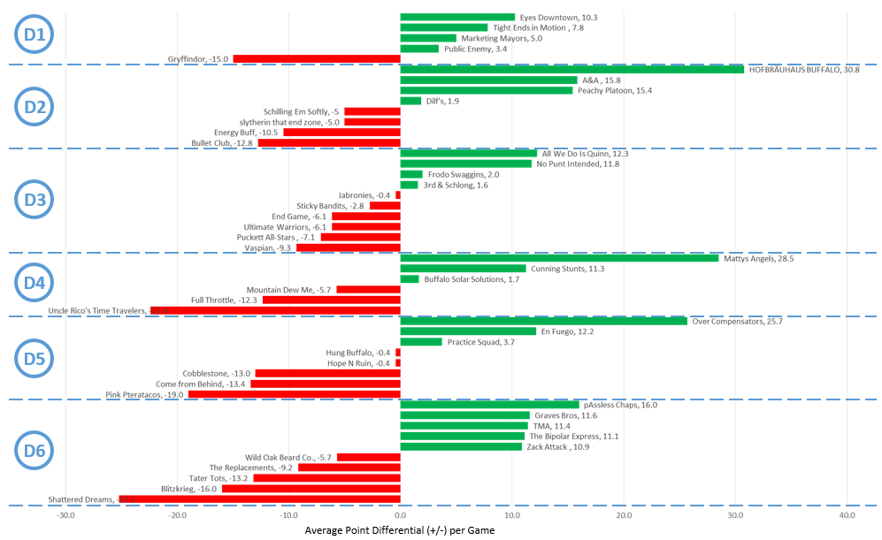 Overrated: No one’s REALLY underrated or overrated here, as this is the ONLY division in TSL this session where the point differentials rankings EXACTLY match the standings (look at the chart above) which suggests that teams finished exactly where they should have in the standings. But if we were forced to choose one “overrated” team we’d say maybe Hung Buffalo. Their #3 seed implies they have a chance to win this division, and we don’t see it happening. They’re 5-4 but they lost to Over Compensators by 17 points and En Fuego by 20. These are the teams you have to beat if you want a shot at the D5 title this season, and Hung Buffalo hasn’t shown that they can hang with either of these teams despite their winning record.