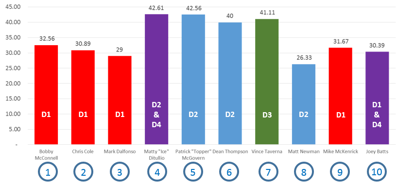 We warned you, Larry Chruscial #12. Playing in D5 you were always at risk of falling out of the Top Ten if a higher division quarterback had a big week, and unfortunately Mike from TEIM and Joe Miano #11 of Jabronies got some big wins while you were on a bye. We’ve talked about Mike already, but how about Joe Miano with the double win this week? The Godfather had ranked Sticky Bandits and Frodo Swaggins as having the second and third best odds to win D3, and Joe beat them both in back to back games. The Jabronies are now second place in D3 with their only loss to first place All We Do Is Quinn, and Joe Miano is proving that he’s more than talented enough to justify the jump up from D6.