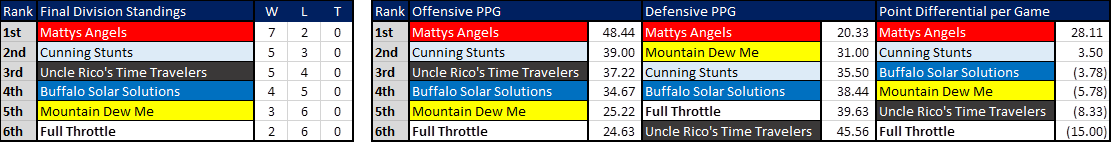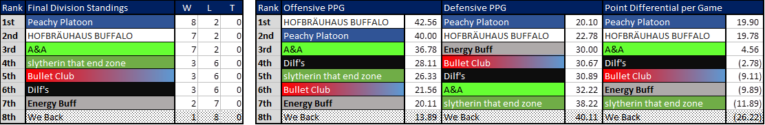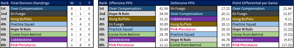 If you think the colors on THAT were annoying, get ready for our end of year Stat rankings! Just like last season, we’ve tried to break down each division to show which teams had the best offenses (points per game), defenses (points per game allowed) and overall point differential (average +/- per game). To make it easier to find your team in various columns, we decided to color code everyone based on their “official” team color scheme (if you share the same color as someone else, we might have picked a different color for you… we can only show so many blacks and grays). This is a visual abomination, we know, but fuck it, we spent a lot of time on coloring this so we’re not changing it back now. Here you go!