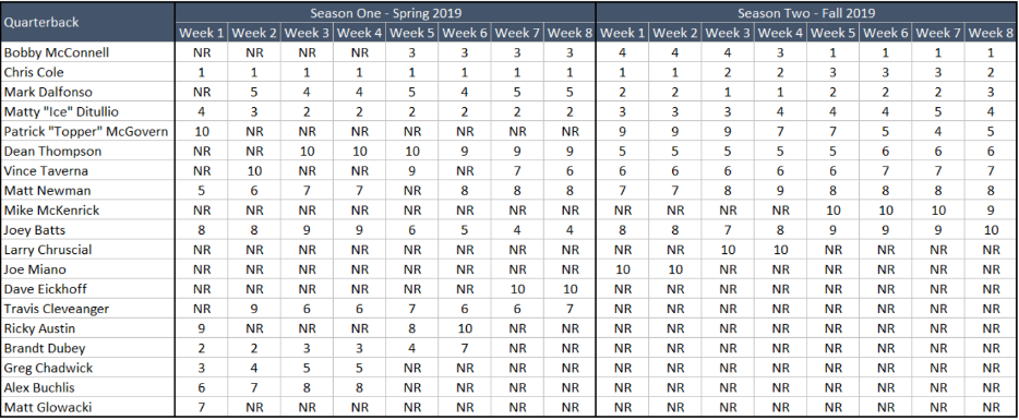 Chris Cole, Matty Ice and Joey Batts are the only three QBs to be ranked in the Top Ten every week since the Power Rankings began. Mark Dalfonso missed out in the first ever week of Power Rankings (a shameful omission on our part, but we can't correct it now), Bobby McConnell missed the beginning of the Spring 2019 season and wasn't ranked for four weeks (though his backup consistently made the Top Five in his place... maybe anyone could succeed surrounded by that much talent?) and Matt Newman missed one week as well (don't blame us, he should have played better).